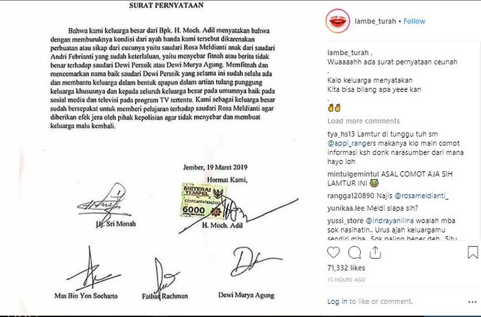 Surat pernyataan keluarga besar Dewi Perssik atas tindakan Meldi.(Instagram/lambe_turah)