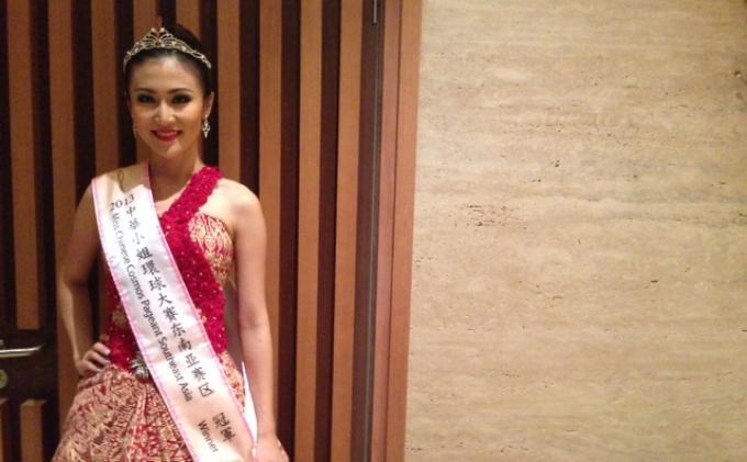 Malam itu, perempuan yang juga menyandang gelar Miss Chinese Cosmos Asia Tenggara 2013 tersebut mengenakann gaun rancangan desainer kelahiran Kalimantan Clara Niken Asterina.