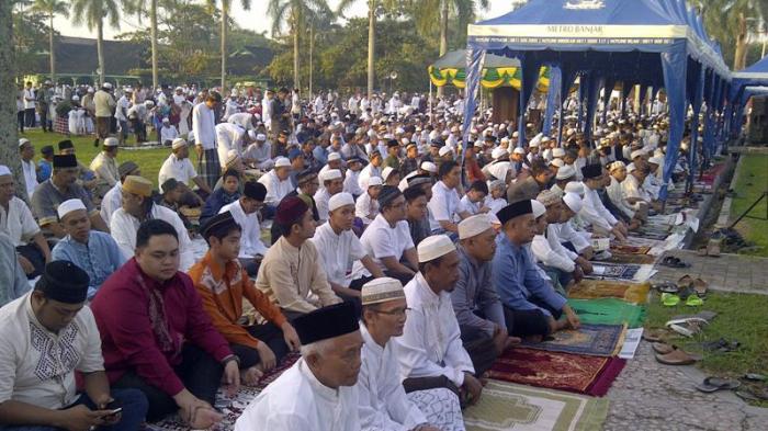 Jamaah mulai memadati halaman Masjid Raya Sabilal Muhtadin tempat berlangsungnya Salat Ied. Rudy Ariffin seusai melaksanakan Salat Ied akan menggelar open house.