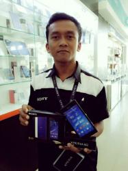 Promotor Arthomoro, Taufik menerangkan Sony Xperia M2 salah satu produk baru yang menghiasi etalase jualan produk gadget Arthomoro.