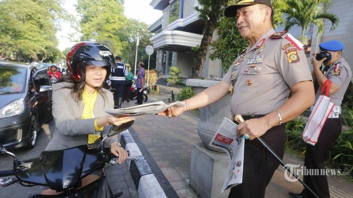 Kapolda Bali, Irjen Pol Benny Mokalu saat membagikan koran Tribun Bali, beberapa waktu lalu.