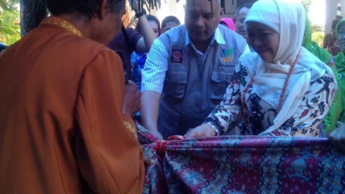 BANJARMASINPOST.CO.ID, PALANGKARAYA - Menteri Sosial Khofifah Indar Parawansa berkunjung ke Kalimantan Tengah, Minggu (22/2/2015) untuk kunjungan kerja dan menghadiri Harlah Muslimat NU ke-69. Sesampainya di Bandar Udara Tjilik Riwut, Palangkaraya, Khofifah disambut upacara adat pantan timpung, yaitu penyambutan tamu khas suku Dayak.