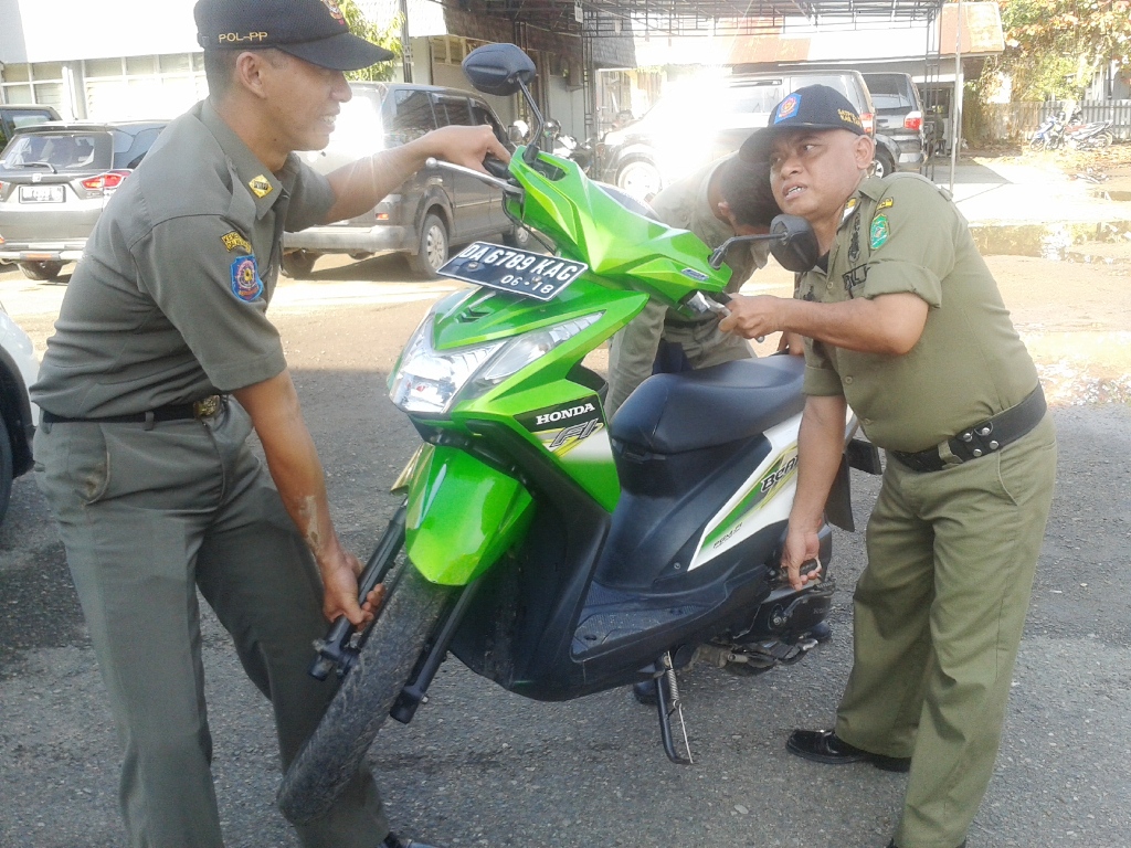 Tiga personel Satpol PP Kabupaten Tapin terpaksa mengangkat sebuah sepeda motor yang parkir sembarangan di ruang parkir sekretaris daerah Tapin.