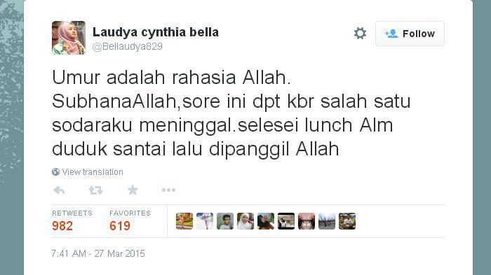 “Umur adalah rahasia Allah. SubhanaAllah,sore ini dpt kbr salah satu sodaraku meninggal.selesei lunch Alm duduk santai lalu dipanggil Allah”. Demikian bunyi salah satu kicauan Bella di akun resmi Twitternya.
