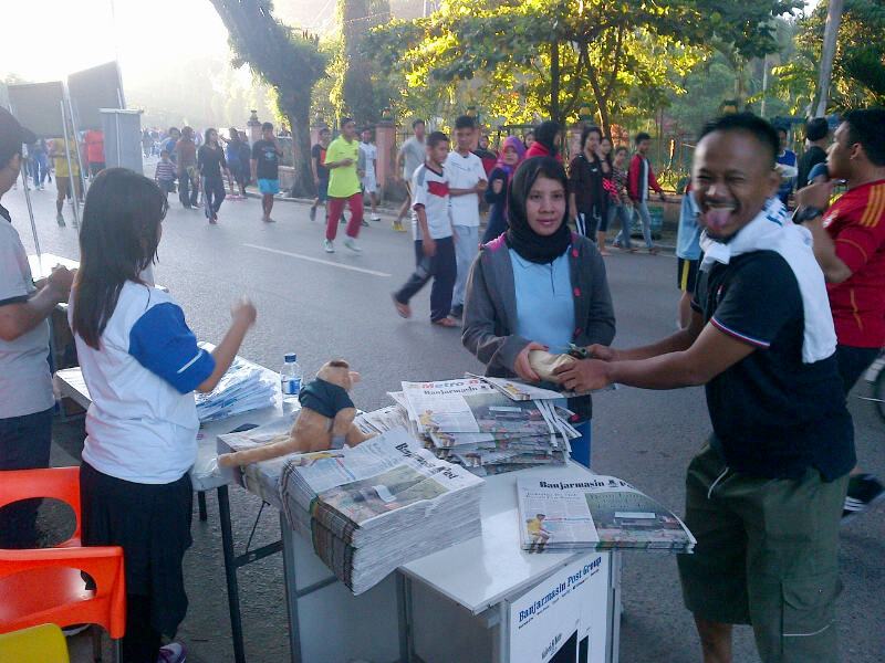 Mereka langsung membeli koran BPost dan Metro Banjar dan mendapatkan bonus kaus.