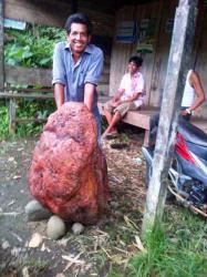 Batu merah yang berukuran cukup jumbo bahkan sepertinya lebih besar dari batu merah sebelumnya tersebut sudah dipindahkan dari sungai ke atas tebing dan diletakan di depan pos Kamling di depan Kantor Polsek Loksado.