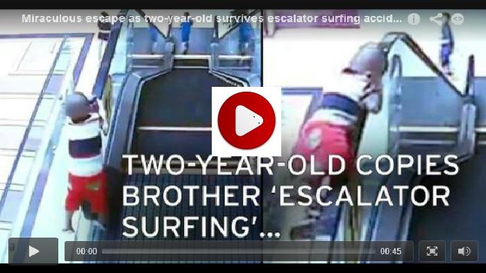 Menakutkan saat balita terjun 30 kaki setelah menyalin saudaranya 'eskalator surfing' di pusat perbelanjaan di Dongguan, Provinsi Guandong, di Tiongkok, Selasa (19/5/2015).