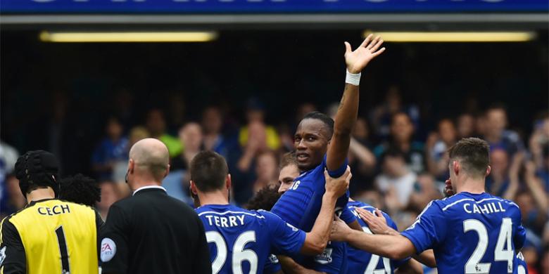 AFP/BEN STANSALL Para pemain Chelsea menggendong dan mengarak Didier Drogba ketika dia ditarik keluar dalam laga terakhir Premier League melawan Sunderland di Stamford Bridge, Minggu (24/5/2015).
