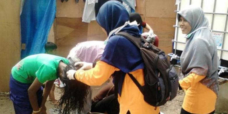 "Sebanyak 50 pengungsi wanita secara bergantian dibersihkan rambutnya oleh relawan wanita. Untuk membersihkannya pun tidak menggunakan shampo biasa, tapi shampo khusus membersihkan hewan kutu yang bersarang di rambut," jelas Herlan Wilandariansyah, Sabtu (23/5/2015) lalu.