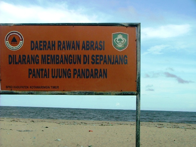 Adanya keluhan warga terutama nelayan yang bermukim di bibir pantai terkait abrasi ditindakanjuti Pemkab Kotim dengan membuat papan peringatan larangan membangun rumah di pinggir pantai.