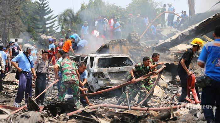 Tangis histeris para keluarga korban pesawat Hercules tak terbendung di Lanud Ranai. Mereka berkumpul di depan ruang check-in menunggu informasi lanjutan terkait nasib keluarganya.