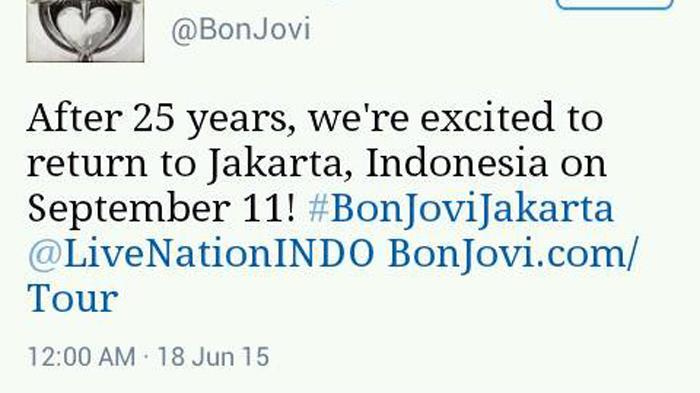 “@BonJovi : Happy Independence Day Indonesia! Dirgahayu Republik! See you on Sep 11. #BonJoviJakarta @LiveNa tionINDO http://BonJovi.com/Tour,” tulis mereka melalui akun Twitter resmi @BonJovi, Senin.