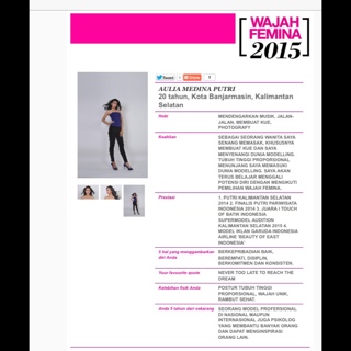 Foto cantik Aulia Medina Putri ikut terpampang di majalah Femina bersama puluhan peserta lainnya yang berhasil lolos pada pemilihan Wajah Femina 2015.
