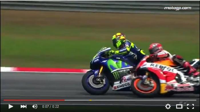 Sebelum insiden, juga tampak Rossi memberikan isyarat jari tangan kiri saat berhasil mendahului Marquez. Entah apa artinya, bisa saja mengingatkan Marquez agar tidak agresif, atau Rossi meminta maaf atas karena sudah mendahului, semacam psywar.