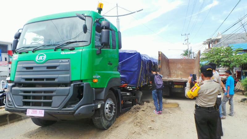 Akibat terperosoknya mobil trailer ini, arus lalu lintas terganggu, dan sementara dialihkan menjadi satu jalur.