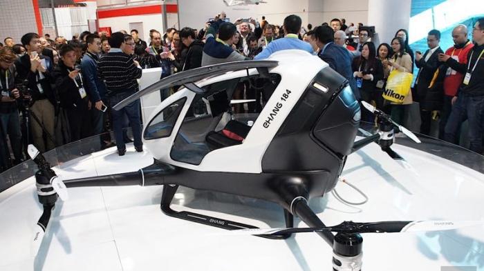 Pesawat drone otomatis yang bisa ditumpangi manusia ini dipamerkan di ajang pameran elektronika terbesar Consumer Electronics Show, Rabu (6/1) di Las Vegas.