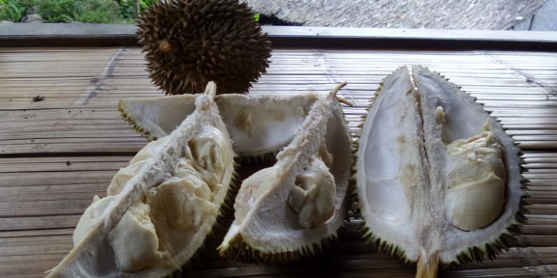 Pemandu kami, Endang (40), menunjukkan pohon durian tua yang batangnya tak muat dipeluk oleh lengan dua orang dewasa. Pohon tersebut masih tegak berdiri, tetapi sudah dilirik pembeli kayu dengan harga sangat murah, sekitar Rp 2 juta.
