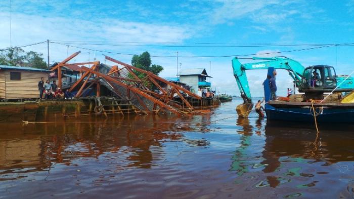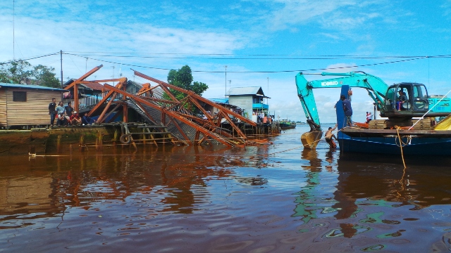 LCT membawa eksavator tampak membersihkan rangka Jembatan Mambulau di dasar sungai yang patah.