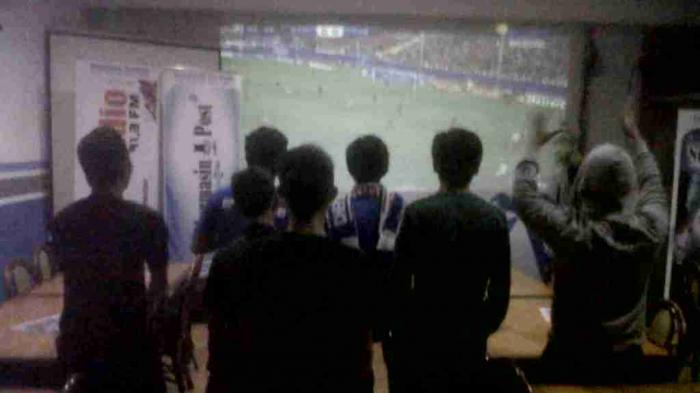 Para fans tim MU yang menggelar nonton bareng di D Cafe ini langsung bersorak kegirangan karena tim kesayangan unggul sementara.