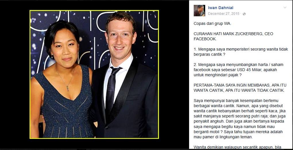 Salah satu kisah yang banyak diposting di akun facebook adalah mengenai pernikahan Mark Zuckerberg dan sang istri Priscilla Chan.