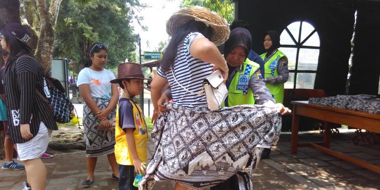 Sejumlah pengunjung dengan penuh kesadaran kemudian menghampiri pos itu lalu seorang petugas dan polisi wanita memakaikan kain sarung.