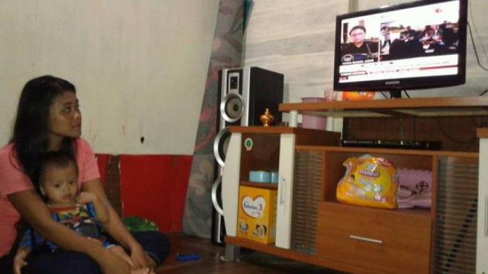 Halimatus Sadiah yang sedang memangku anaknya, terlihat terus memperhatikan televisi yang tengah memberitakan mengenai informasi pembebasan suaminya.