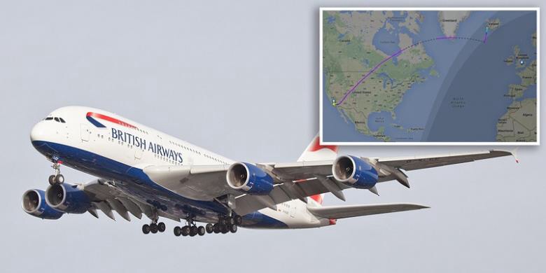 Pesawat dengan nomor penerbangan BA 282 dari Los Angeles, AS, menuju London, Inggris, itu sedang di ketinggian jelajah 38.000 kaki atau sekitar 12.000 km di atas permukaan laut.