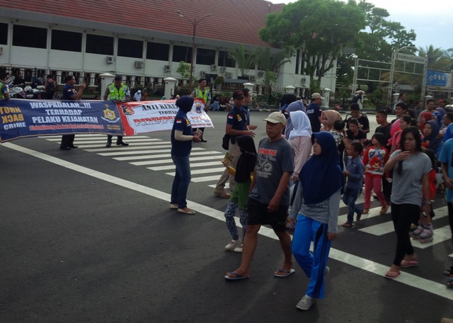 Para aparat yang turun juga membagi-bagikan ratusan stiker. Intinya berupa imbauan pentingnya menjaga anak dan perempuan dari tindak kekerasan.