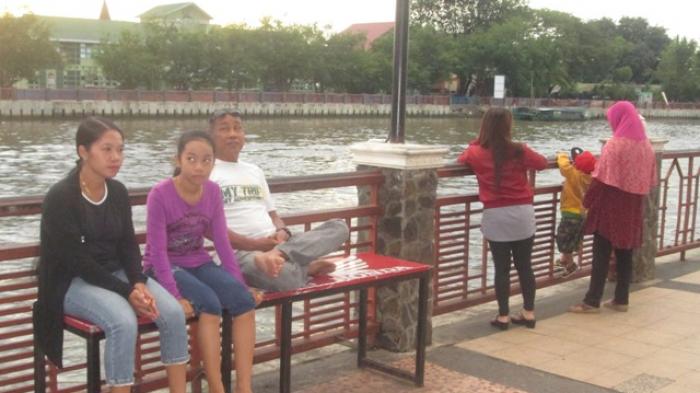 Kebiasaan menunggu azan Magrib di Siring Piere Tendean antara lain kerap dilakukan Burhan. Warga Sungaindai, Banjarmasin, ini tak sendirian saat nyantai di tempat itu, tapi selalu bersama keluarganya.