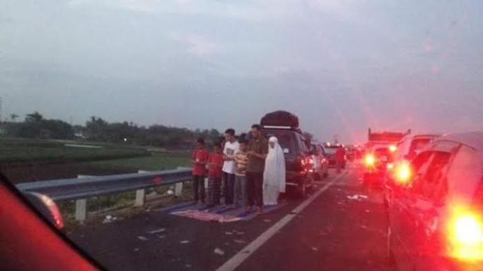 Namun di tengah kemacetan parah, ada pemandangan menakjubkan yang sempat ditangkap kamera sejumlah netizen. Sebuah keluarga terlihat melakukan salat berjamaah di pinggir jalan tol.