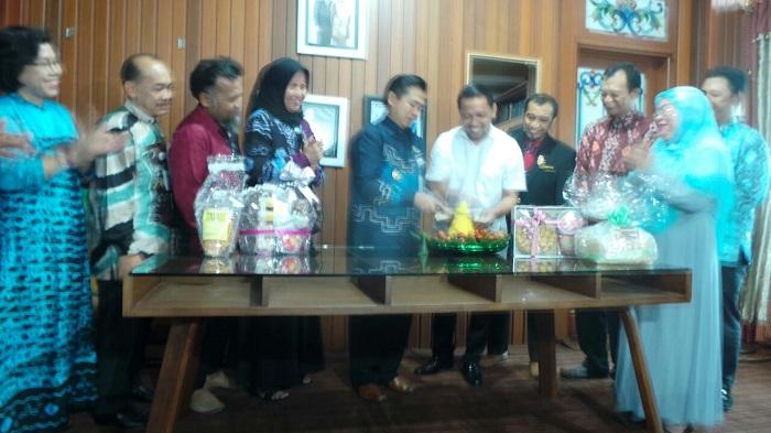 Mereka membawa tumpeng bersama sejumlah produk UMKM. Mereka ingin merayakan HUT pertama UMKN bersama wali kota. Ibnu pun didaulat memotong tumpeng tersebut.