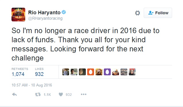 "So I'm no longer a race driver in 2016 due to lack of funds. Thank you all for your kind messages. Looking forward for the next challenge."