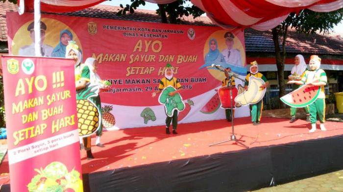 BANJARMASINPOST.CO.ID, BANJARMASIN - Aneka buah, brokoli, paprika, pisang, semangka, dan nenas, menari-nari penuh ceria. Itulah gaya siswa-siswi SDN Karang Mekar 9 yang menari dengan berkostum sayur dan buah-buahan.