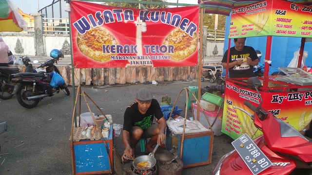 Namun kuliner yang jarang ditemukan ini, yang berdagang bukan orang Betawi kebanyakan. Akan tetapi orang dari Jawa Tengah. Pedagang ini mengaku berjualan kerak telur pada hari-hari setiap ada kegiatan seperti FSQ, MTQ atau hari kemerdekaan RI.