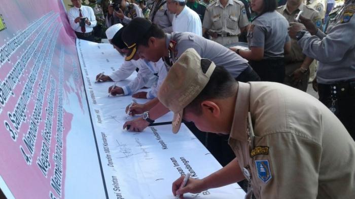 Usai apel, dilanjutkan pembubuhan tanda tangan di spanduk deklarasi bersama kemudian dilanjutkan tatap muka dan silaturahim dengan Kapolres di Aula Polres.