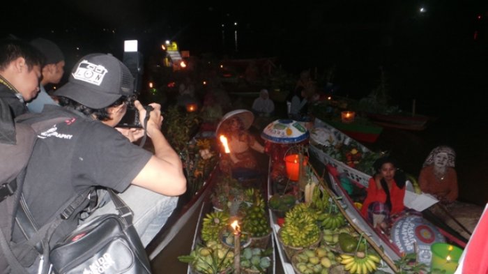 Menggunakan Jukung yang dihiasi beragam barang dagangannya, kehadiran mereka tersebut menarik perhatian ratusan pengunjung serta pelancong dari berbag