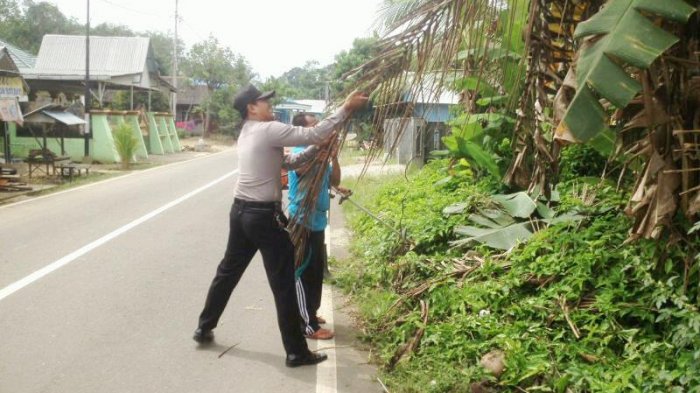 Polisi dan Warga Bersihkan Rumput dan Ranting Dipinggir Jalan