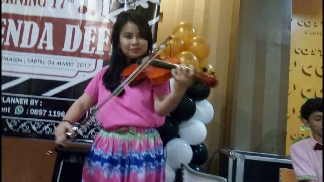 BANJARMASINPOST.CO.ID, BANJARMASIN - Penampilan Nur Husna Putri saat memainkan biola dengan lagu 'Perahu Layar' mampu menghibur teman-temannya di acara promosi sebuah sepeda motor di SMK Farmasi ISFI Banjarmasin, Sabtu (16/4/2017).