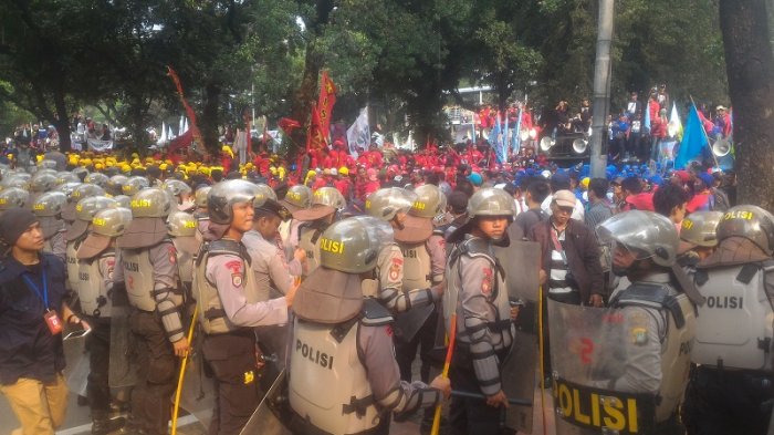 Sebelumnya sekitar pukul 14.40 WIB, masa dari Konfederasi Serikat Pekerja Seluruh Indonesia (KSPI), yang menggelar aksi di depan kantor Kementerian Pariwisata, Jakarta Pusat, sempat menarik pagar kawat berduri yang melintang di Jalan Medan Merdeka Barat.