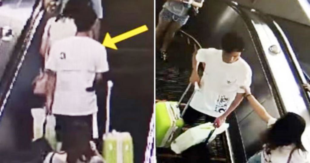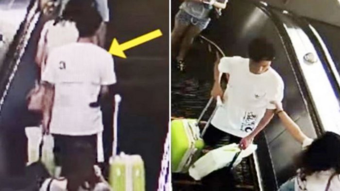 Dalam rekaman CCTV, tampak seorang lelaki berdiri di belakang wanita dalam eskalator (tangga jalan).