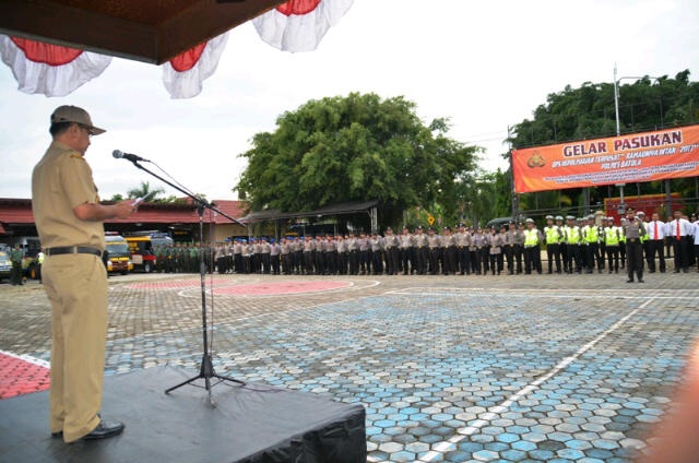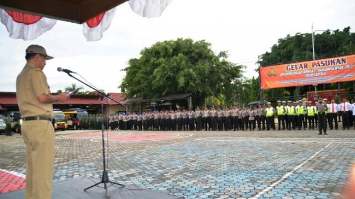 Apel dipimpin Wakil Bupati Batola H Ma’mun Kaderi ditandai pengecekan pasukan serta penyematan secara simbolis tanda tugas kepada seluruh unsur pengamanan mulai personil TNI, polisi, dinas perhubungan, satpol PP, satpam.