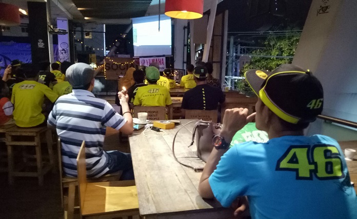 BANJARMASINPOST.CO.ID, BANJARMASIN - Keseruan acara nonton bareng (nobar) seri ke 10 MotoGP di Social Cafe, dipenuhi para pendukung pebalap asal Italia yang tergabung dalam komunitas Rossifumi Banjarmasin.