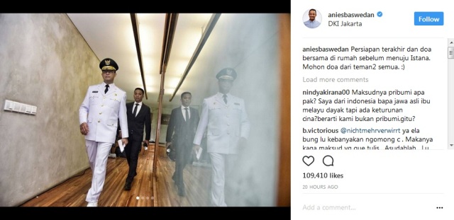 Banyak akun yang meluapkan sindiran akan pidato Gubernur DKI Jakarta, Anies Baswedan yang menggunakan kata pribumi.