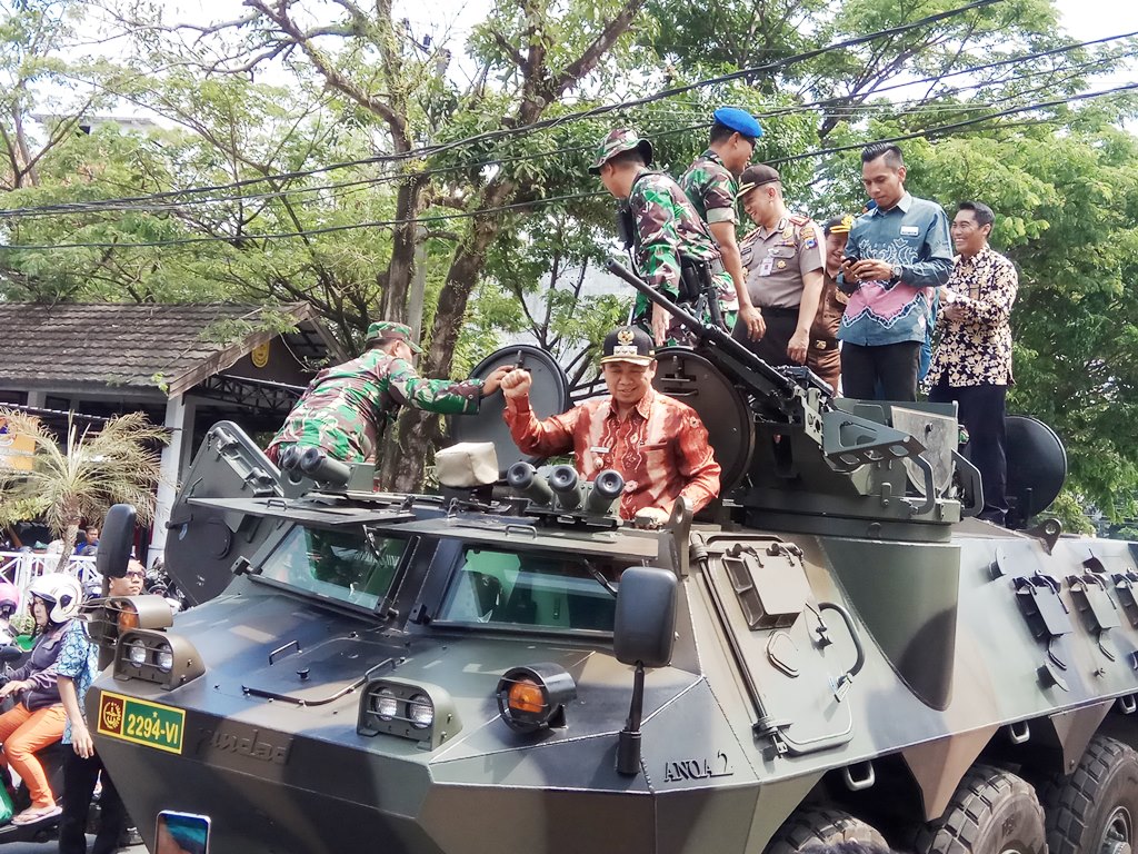 Ibnu Sina naik panser didampingi Dandim 1007 Banjarmasin Kolonel Infantri Wilson Napitupulu.