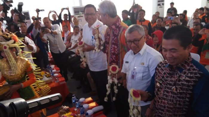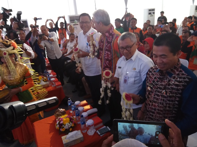 Terlihat, Gubernur Jawa Tengah (Jateng) Ganjar Pranowo, Wali Kota Banjarmasin Ibu Sina, Pimpinan Umum BPost Group HG (P) Rusdi Effendi AR dan tamu dan sejumlah kementrian menerima bunga selamat datang, Rabu (1/11/17) pagi.