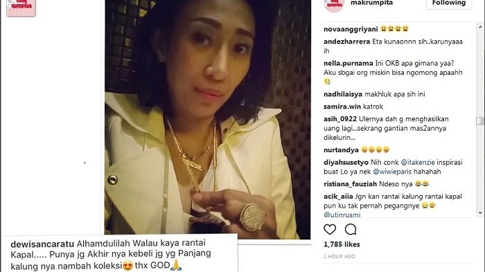 Dia menuliskan “Alhamdulillah Walau kayak rantai Kapal…..Punya jg Akhir nya kebeli jg yg Panjang kalung nya nambah koleksi thx God @dewisancafans.”