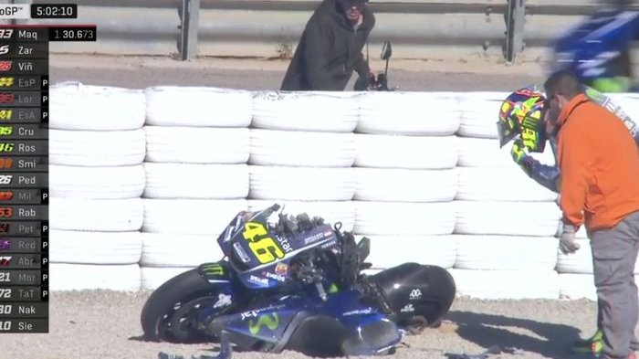 BANJARMASINPOST.CO.ID - Valentino Rossi menjalani tes pramusim MotoGP 2018 di sirkuit Ricardo Tormo, hari ini (14/11/2017) kurang begitu mulus, dia mengalami kecelakaan sampai motornya rusak.