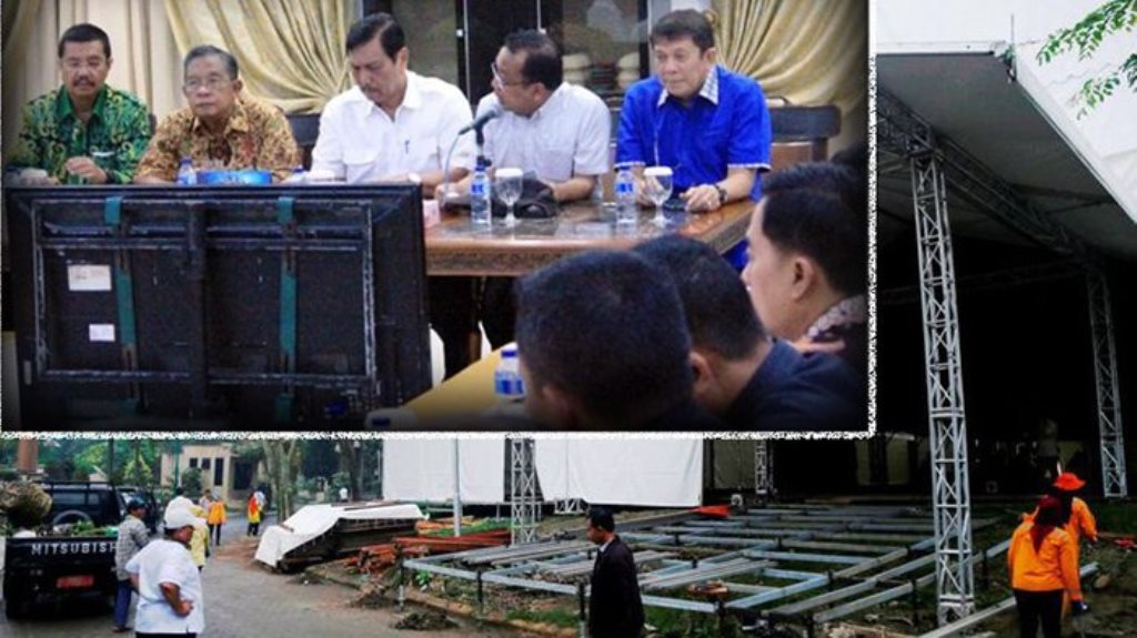 Para petugas sibuk menyiapkan pendingin ruangan di lokasi resepsi.