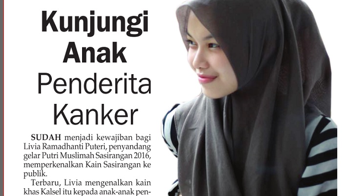 BANJARMASINPOST.CO.ID, BANJARMASIN - SUDAH menjadi kewajiban bagi Livia Ramadhanti Puteri, penyandang gelar Putri Muslimah Sasirangan 2016, memperkenalkan Kain Sasirangan ke publik.