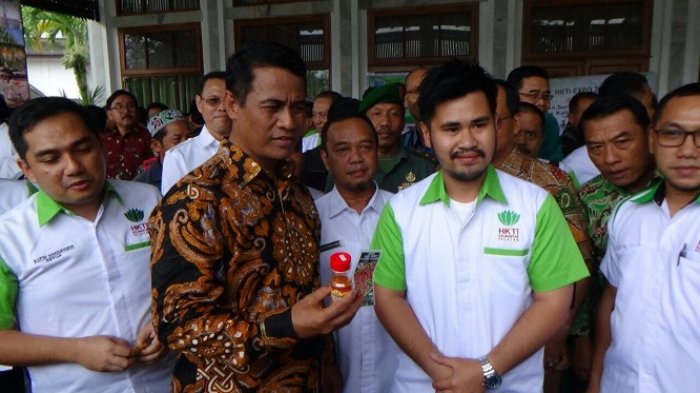 Ketua Himpunan Kerukunan Tani Indonesia (HKTI) Tapin H Dedy Arief yang mendampingi Menteri Pertanian Amran Sulaiman menjelaskan tentang abon cabai yang dipegang menteri tersebut.